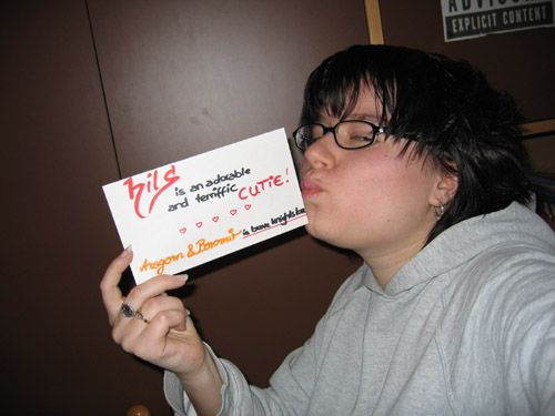 jacqui_hw: It still amazes me how things have turned out. It started when I e mailed her and asked her if I could archive one of her fics on my site. She then e mailed me her new ones and I posted them all because they were excellent. Finally we started chatting on IM and realised we didn't live that far away from each other. We thought about meeting up and finally Jacqui asked me if I wanted to go and see Ghost of the Robot with her. We met on the train and sort of chatted quietly before the gig. Then we met James. It was all down to Jacqui who spotted him when I was ready to leave. We had our photos taken with him and we both gushed all the way home and for a long portion of the night. Our friendship was sealed that day and we met up one weekend a month every time after that. Eventually we talked about getting a flat together and now here we are in the fangirl pad. Jacqui seems to be the one who gets me involved in new fandoms. She put me onto Sparrington, she told me about Orlando Bloom and Sean Bean which got me reading RPS and she is just generally fab